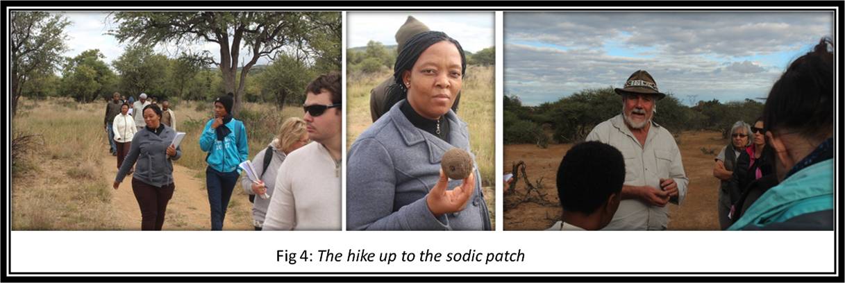 Then it was back to the Ed centre to finish off for the day, with a hike from the Ed centre to a sodic site. There Bob engaged us in an experiment on how to feel the content of the soil you are dealing with. This was done by collecting soil and wetting it so that you will be able to make a ball out of it. After the ball, you have to make a “sausage”. The thinner you can roll the “sausage” before it breaks, the more clay there is in the ground.