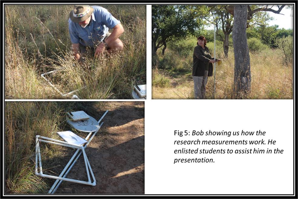 Sunday morning we were back at the Ed centre at 07:30 – bright and early where Bob gave us a last view of veld management – the role of fire and the effect thereof. He also had a few measurement tools to help with research, and we discussed how research should be approached.