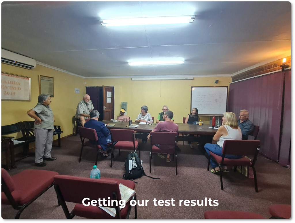 Friday night was time for another test, this time around with no load shedding and nobody left behind. After the test it was time to see just what we were in for, with Maria and Peter giving us the results for our ecology and wetlands tests. We now all know that the answer to Question One is not “Whiskey”, although some of us are still not so sure of that!