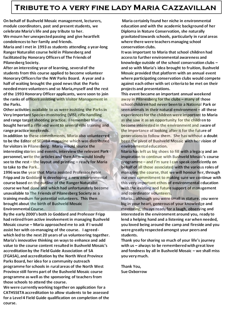 R.I.P Maria your memory will live on in Bushveld Mosaic