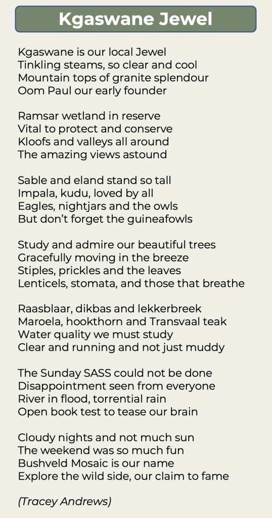 The 2022 weekend for catchments, wetlands and rivers took place from 8-10 April at the beautiful Kgaswane Mountain Reserve near Rustenburg. The weather report for the weekend predicted 15mm of rain on Friday, 36mm of rain on Saturday and 60mm of rain on Sunday! We were warned to come prepared, and we all did – but we still got wet. This did not, however, dampen our spirits, and we still had fun! It was definitely a ‘wetland’ weekend.